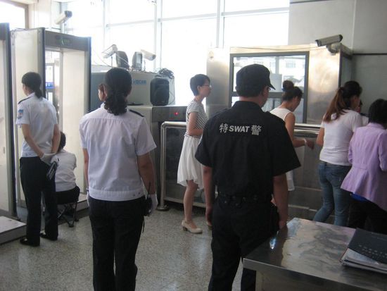 呼和浩特 鐵路公安局、呼和浩特鐵路公安處集寧南站派出所嚴密安檢措施,對進站旅客和行包采取“二次”手檢,根據人身容易藏匿物品的部位特點,自創“馬扎”式安檢方法,杜絕漏查、漏檢現象的發生,具體做法如下:旅客逐人通過進站口安全門檢查時,金屬安全門警示燈亮起,2名安檢員一左一右,站在被檢人側前方45度角的位置,同時對旅客進行全方位人身手檢,其中一人站立負責上身手檢,另一人坐在馬扎負責下身手檢。站立上身手檢順序從頭部、頸部、衣領、墊肩、左臂、左腋下、左前胸、右前胸、右臂、右腋下、腰部,然后請被檢人轉身對其背部進行檢查,依次由頭部、后肩、背部、后腰進行檢查。坐姿下身手檢順序從右腿、右腳踝、右腿后側、腿內側至左腿、左腿后側、左腳踝進行檢查。